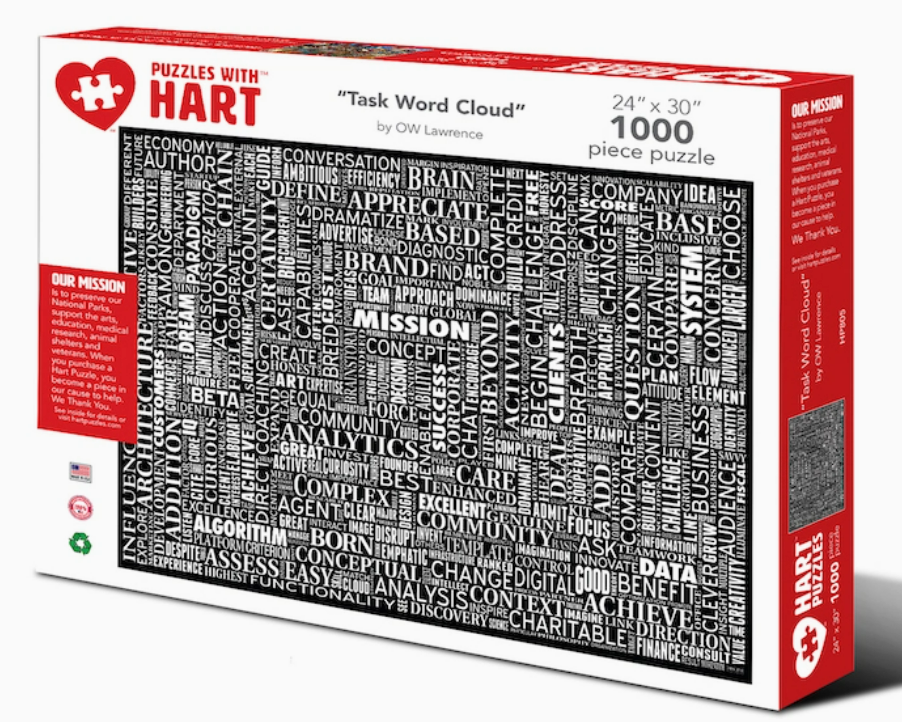 The language of visual design. The basis of these words were from “How to Win Friends and Influence People” by Dale Carnegie. The artist then added words from today which are relevant and positive. When you tackle this puzzle with your team you can’t help but have a positive lookout on life and the work before you. Maybe learn something new as you put together this 24”x 30” 1000 piece puzzle. By OW Lawrence.