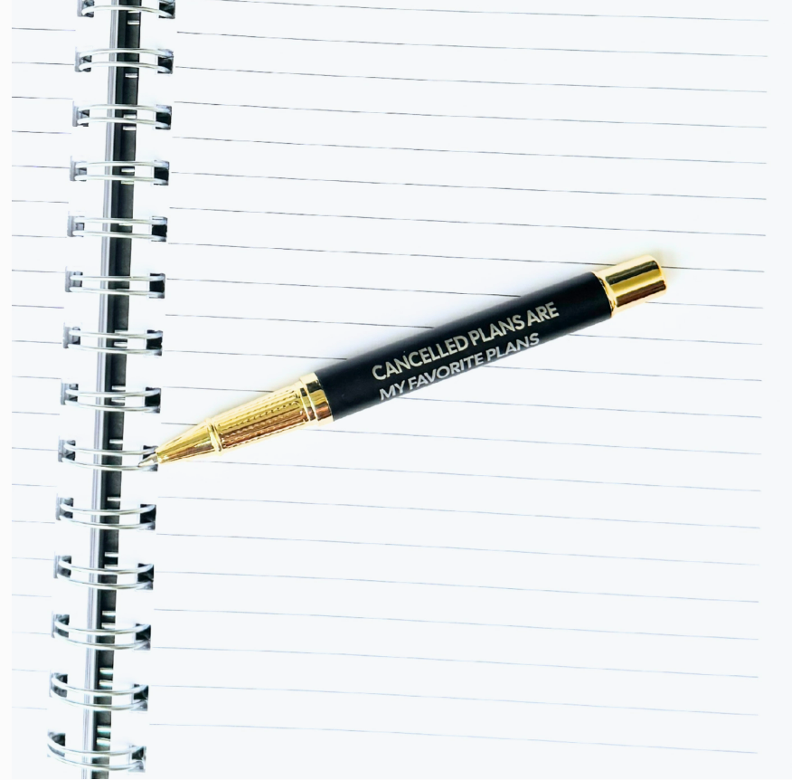 Journal artwork: LOVER OF CANCELLED PLANS Pen Reads: CANCELLED PLANS ARE MY FAVORITE PLANS A5 journals are the perfect size for your desk or on the go, and have 140 pages (70 sheets) inside. BEST part?? A MATCHING PEN! Each journal has a printed pen that matches the theme of the journal!